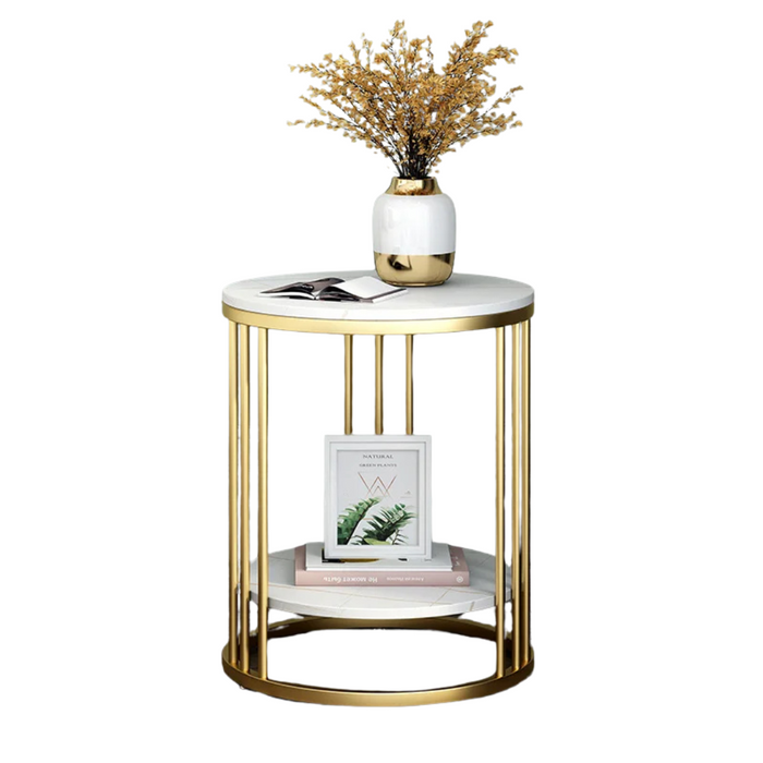 - Color: White marble top with a contrasting metal frame