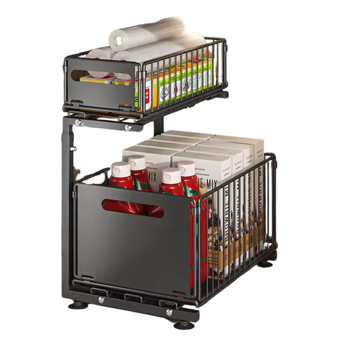 Optimize your kitchen or bathroom storage with this 2-tier pull-out cabinet organizer. Made of durable carbon steel, this versatile storage rack is designed to help you organize your cabinets, pantry, or under-sink areas efficiently. Featuring an adjustable height system with five settings, you can customize the rack to suit your storage needs. The upper layer is ideal for small items like spice jars and cloths, while the lower layer accommodates taller bottles and larger objects. The sturdy design and strong bearing capacity make this organizer perfect for holding a variety of items.