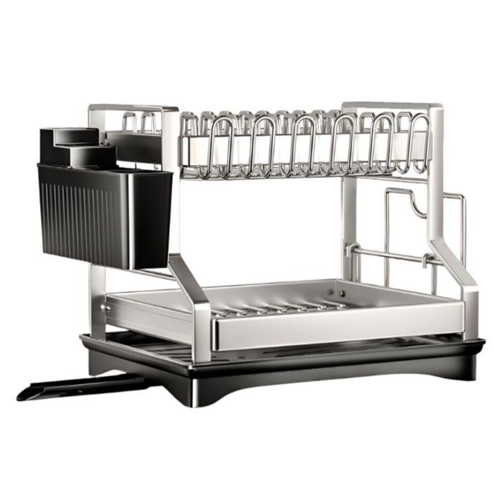 Maximize your kitchen space with this 2-tier dish drying rack, designed for efficient dish organization and quick drying. Featuring a sturdy metal frame, dedicated compartments for utensils, and a drainboard to keep your countertop clean, this organizer is perfect for any modern kitchen.